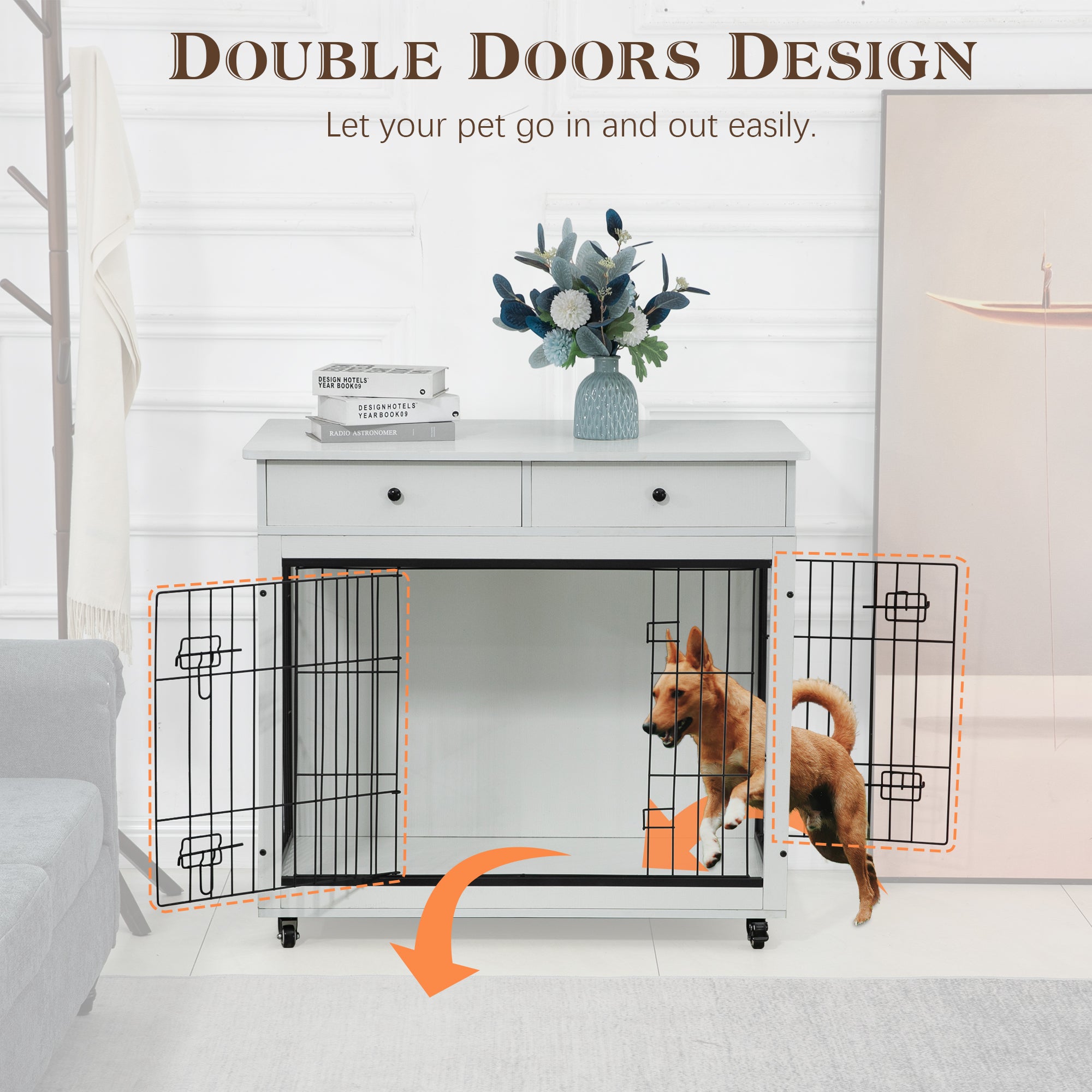 Dog Crate Furniture, Wooden Dog Crate End Table, 38.4 Inch Dog Kennel with 2 Drawers Storage, Heavy Duty Dog Crate, Decorative Pet Crate Dog Cage for Large Indoor Use (White) 38.4" L×23.2" W×35" H