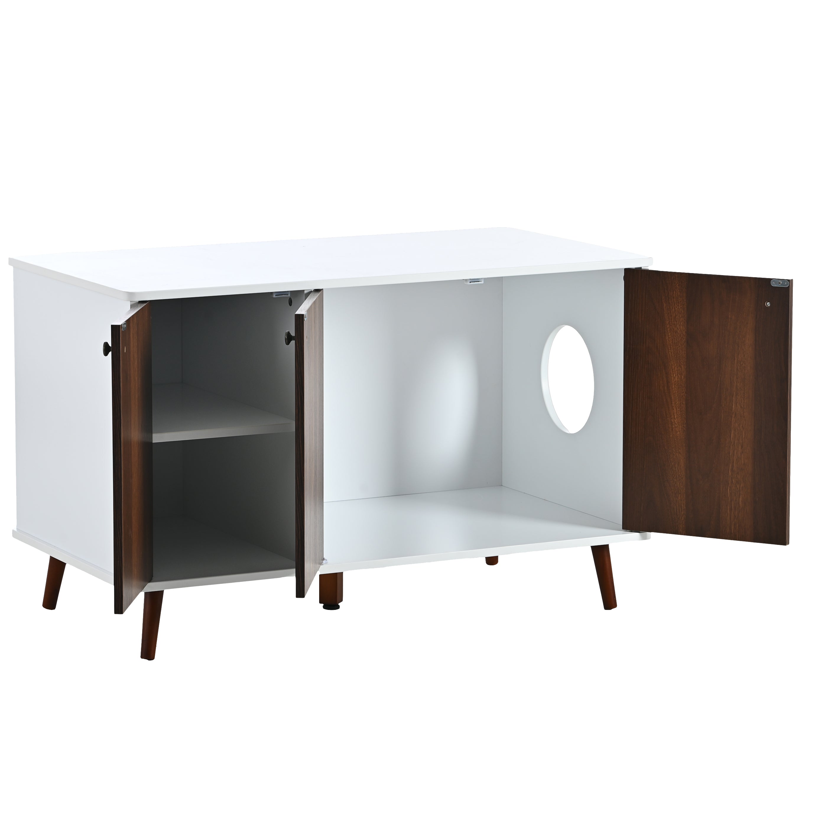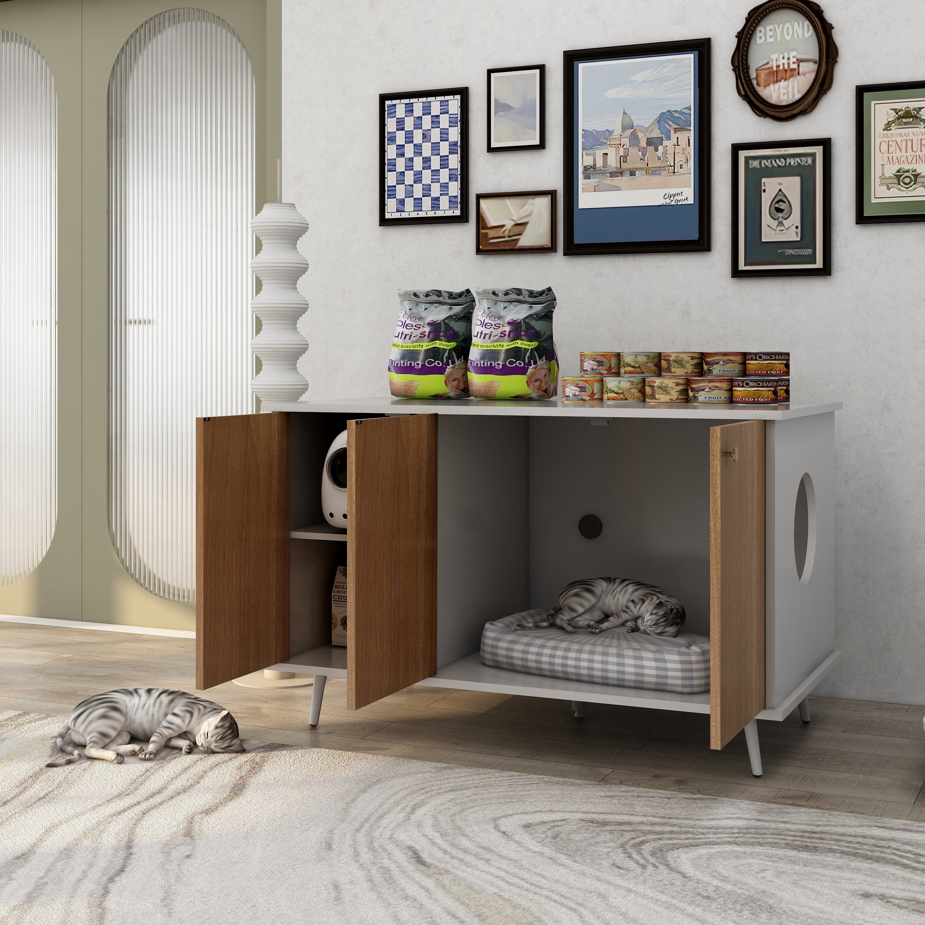 • A Wide Tabletop and Seperate Appartment:This cat house has 3 doors with two diffrent size cabinets, the small one with a shelf, can put Cats snacks and toys, and another house can put litter box, with plug inside, you may put a air purifier to clear the air to give your cat conformation place. The conors of the tabletop are rounded, it looks luxury and safe.