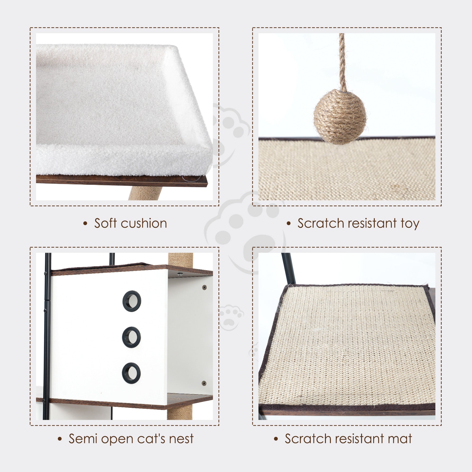 • 4.Thoughtful Details: Platforms for sogespet cat tower condo are equipped with cat scratching pads which can effectively prevent cats from slipping and falling. At the top is a soft line bed to give your cat a comfortable sleep without disturbances.