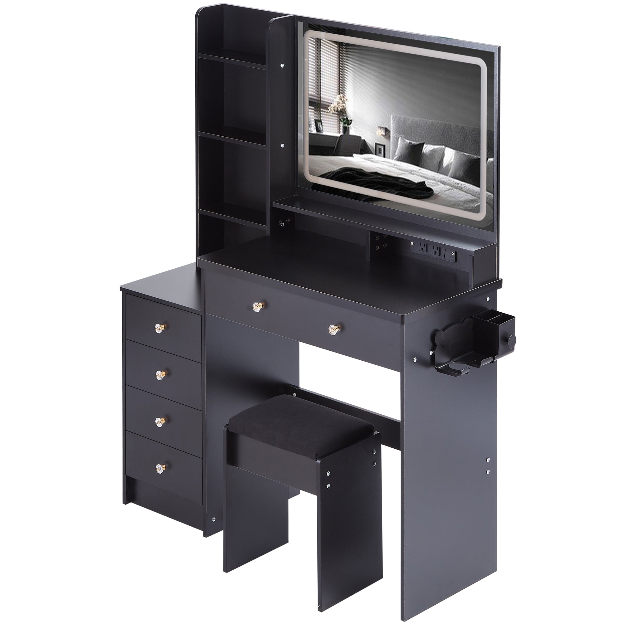41" Large Size Left Bedside Cabinet Vanity Table+Cushioned Stool Dresser Set, 2 AC+2 USB Power Station, Hair Dryer Stand, Extra Large Touch Control LED Mirror, 3-color Switch, EPA, GCC, UL Certificate